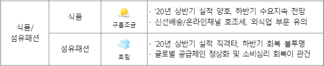 ㅇ 특히, IT·콘텐츠 산업의 전망을 긍정적으로 분석하고 비대면 서비스 확산에 따른 이커머스, 콘텐츠, 온라인 유통, 에듀테크, 스마트 헬스케어 분야의 성장세를 예상했다. 식품 분야는 코로나19의 수혜 산업으로 소비자 구매패턴 변화에 따라 HMR 등 가공식품과 배달외식이 증가할 것으로 전망했다. 아울러 BTS, 기생충 등 한류 열풍과 국가 신인도 향상 등을 K-Food 기업의 해외진출과 성장 기회요인으로 분석했다.