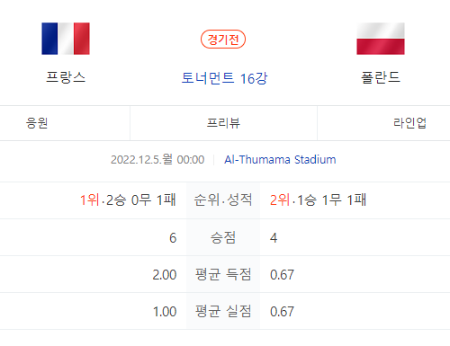 프랑스, 폴란드 16강 경기는 12월 5일(월) 자정 00:00에 진행됩니다.