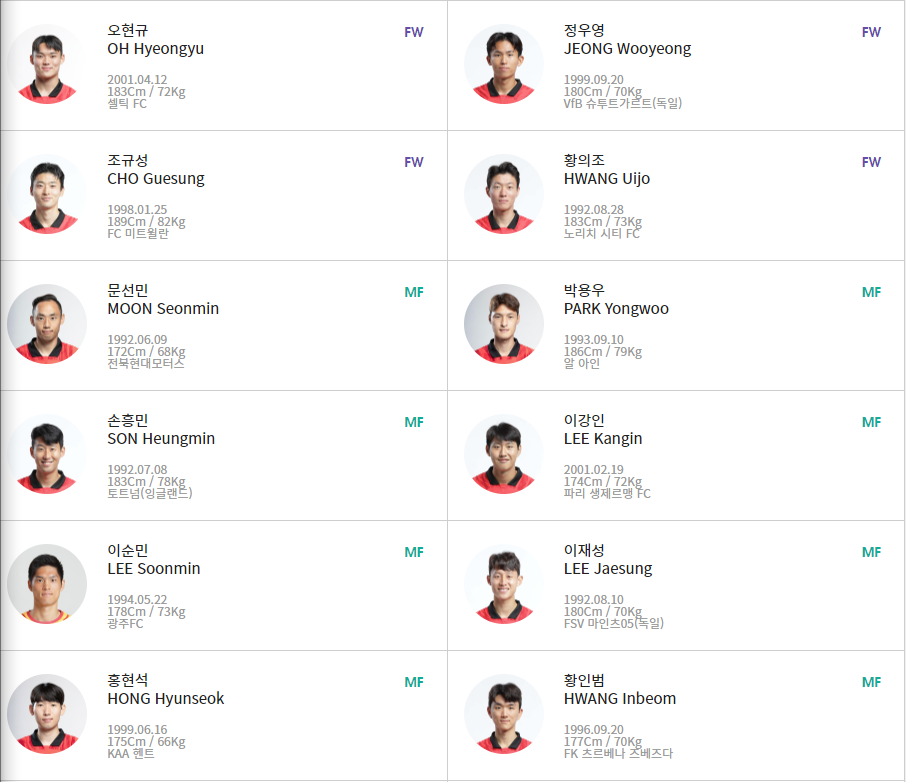- 공격수 : 오현규(셀틱 FC), 정우영(VfB 슈투트가르트/독일), 조규성(FC 미트윌란), 황의조(노리치 시티 FC)
