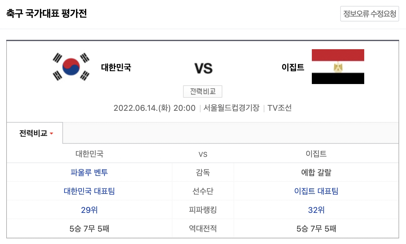 한국, 이집트 평가전 일정 / 장소 : 2022년 6월 14일(화) 저녁 8시, 서울월드컵경기장