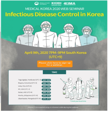 Medical Korea Webinar 2020 Infectious Disease Control in Korea Live Online Streaming and Interactive Q&A Session of Infectious Disease Control in Korea Panels from Korea’s Top Medical Centers **April 9, 2020 7-9 pm(Korean Time) ** For inquiries,  please co