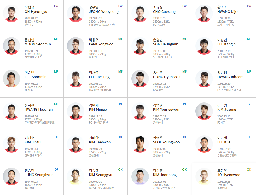 • FW: 오현규(셀틱), 조규성(미트윌란), 황의조(노리치 시티)