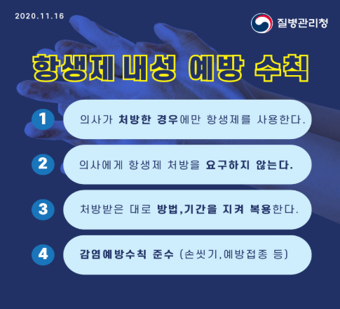 이에 질병관리청세계 항생제 내성 인식주간‘(매년 11월 셋째 주)을 맞아 항생제 내성(‘슈퍼박테리아’)을 극복하기 위한 항생제 내성 예방 수칙 준수 및 실천을 강조하였습니다.