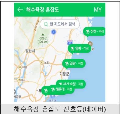 - 네이버 모바일 검색창에 ‘해수욕장 혼잡도’를 검색하면 네이버 지도를 통해 해수욕장 혼잡도 신호등을 확인할 수 있다. 해수욕장 혼잡도 신호등은 주로 이동하면서 확인하는 경우가 많고, 관련 검색어가 주로 모바일에서 검색된다는 점을 감안하여 모바일에서만 서비스가 제공된다.