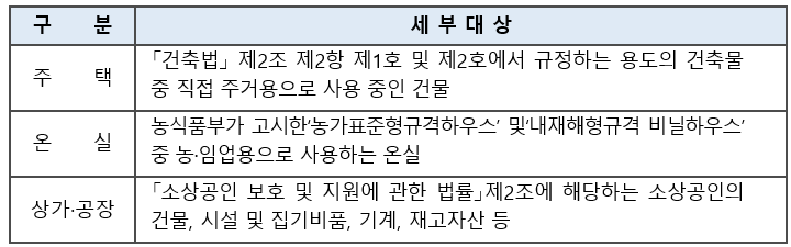 ○ (보험목적물) 주택(동산 포함), 온실(비닐하우스 포함), 상가·공장(소상공인)