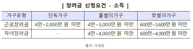 - 근로장려금의 경우 소득은 홑벌이(외벌이) 가구는 3,000만원 미만입니다. 맞벌이. 가구는 3,600만원 미만이 지원대상이 됩니다