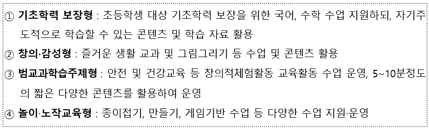- 유치원, 초등학교 저학년 수업 준비 및 운영 지원