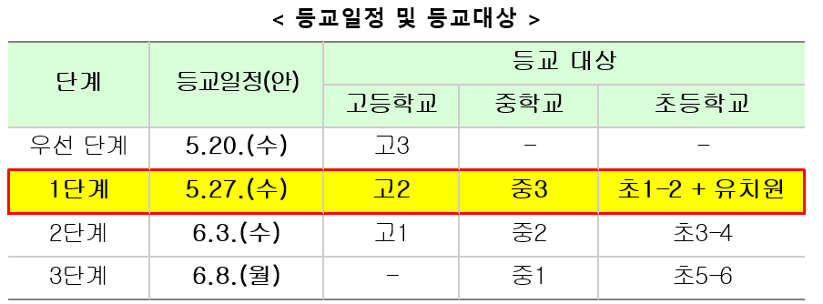 앞서, 교육부는 지역 감염 추이, 현 의료체계상 통제가능성 등을 고려할 때, 등교 수업이 가능하다는 질병관리본부 등 방역당국과 협의를 거쳐 520, 3을 시작으로 순차적 등교 수업을 개시하였다.