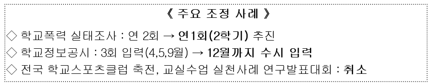 또한, 학교 현장에 부담이 될 수 있는 교육부 추진사업을 과감히축소조정하고, 관련 법령에 따른 사업의 경우는 적극행정 지원위원회 심의를 통해 추진 연기, 간소화 또는 취소 결정을 하였다.