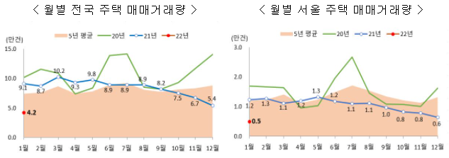 - 2022년 1월 주택 매매겨래량은 총 41.709건으로 집계되었으며, 전월 대비 22.4% 감소하였고, 전년 동월로 비교하면 54%나 감소하였습니다.