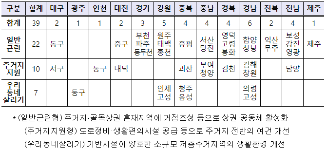 * 인구감소 위기에 처한 지방 중소도시 및 농산어촌의 정주여건을 개선하기 위해 공공임대주택과 지역에 필요한 SOC, 일자리를 한 곳에 종합적으로 제공하는 사업