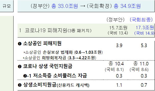 피해계층을 두텁게 지원하기 위해 정부안 33조원 대비 +1.9조원 확대한 34.9조원으로 확정(2.6조원 증액, 0.7조원 감액)하였습니다.