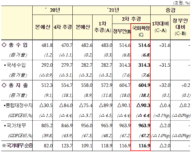 ㅇ (총수입) 1차 추경 483.0 → 514.6조원 (+31.6조원, 전년대비 +6.8%)