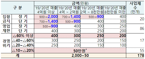 - ❸(지원기준) 지원구간 결정시 ‘19년 매출과 ’20년 매출 중 개별 소상공인에게 유리한 기준 적용*