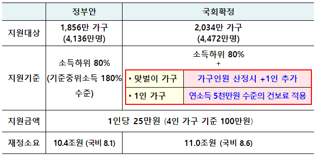 피해계층을 두텁게 지원하기 위해 정부안 33조원 대비 +1.9조원 확대한 34.9조원으로 확정(2.6조원 증액, 0.7조원 감액)하였습니다.