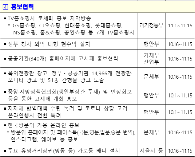 광주 세계김치 랜선축제, 부산 국제수산엑스포, 대전 온통세일 축제, 대구 전통시장 세일행사 등 전국 모든 시·도가 코세페 연계 소비진작 행사를 개최하고,