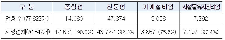 ㅇ 올해 시공능력평가를 신청한 건설업체는 총 70,347개사로 전체 건설업체 77,822개 사의 90%이다.