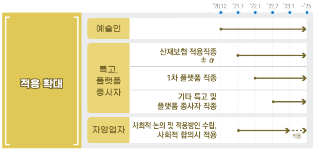’21년부터 산재보험 적용직종 중심으로 적용하되, 우선순위는 “보호필요성·관리가능성·사회적 영향력”에 따라 결정
