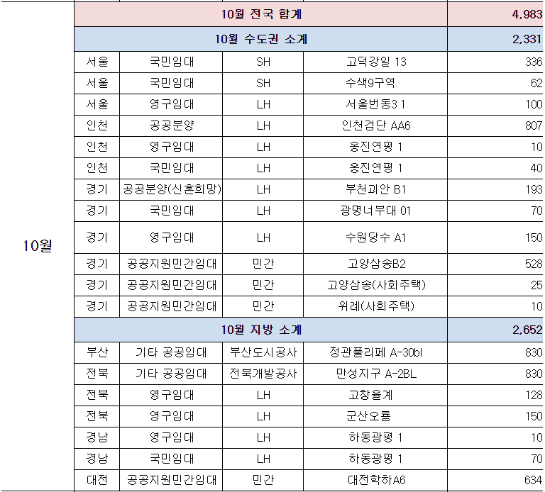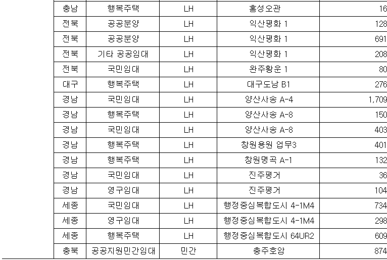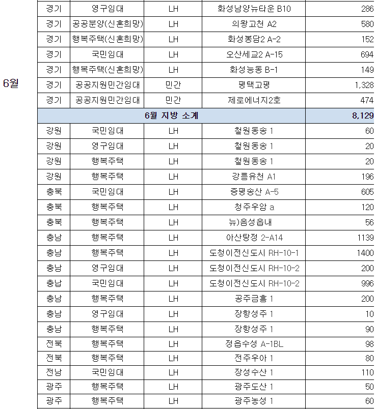 ㅇ (공공임대주택) 경기·인천에서 인천검단(2,746호)·파주운정3(2,052호) 등 105곳 40,276호, 나머지 지역에서 아산탕정(2,935호)·양산사송(1,709호) 등 150곳 37,568호를 공급한다.