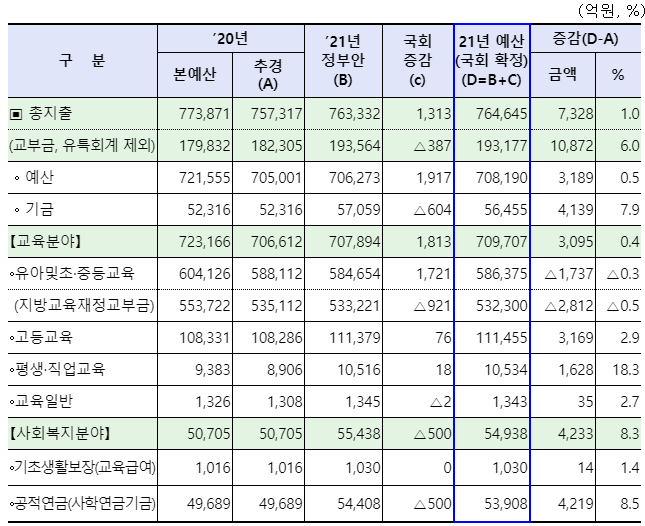 교육부122()에 열린 국회 본회의에서 2021년도 교육부 소관 예산 및 기금운용계획이 2020년 추가경정예산 757,317억 원 대비 7,328억 원 증액된 764,645억 원으로 확정되었다고 밝혔습니다.