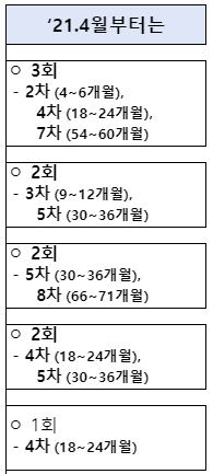 2. 영유아 발달 및 사회적 양육환경 변화 등을 고려하여 영유아 건강검진의 ’건강교육 및 상담‘ 항목 횟수와 주기를 2021년 4월부터 변경한다.