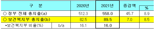 2021년 정부 전체 총지출은 558조 원이며, 보건복지부 총지출 비중은 16%