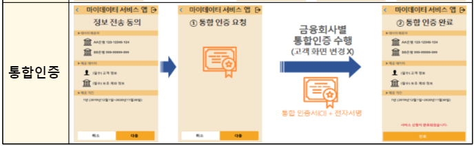 마이데이터 사업자가 정보전송 요청시 금융권에 대해 통합적으로 인증하는 안전한 가칭통합인증 시스템구축(금보원 등)