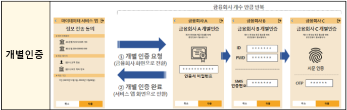 인증시스템 방식으로는, 마이데이터 정보전송 요구시 정보를 제공하는 금융회사 수만큼 인증절차를 반복해야 함