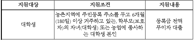 농림축산식품부는 농촌지역 학부모의 교육비 부담을 낮추고, 농촌 출신 대학생에 대한 균등한 교육 기회를 제공하기 위해 등록금 전액 무이자 대출을 하고 있습니다.