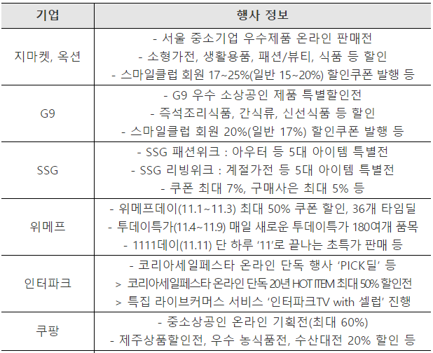 □ 온라인 쇼핑몰별로 특색 있는 컨셉·테마의 할인행사를 기획하는 동시에, 중소기업 및 주요 지자체와 함께하는 특별 판매전을 추진할 예정