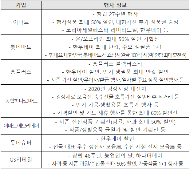 ㅇ (대형마트·기업형수퍼마켓) 이마트, 롯데마트, 홈플러스, 농협하나로마트, 코스트코, 메가마트, 롯데슈퍼, 이마트에브리데이, GS슈퍼 등 주요 업체가 식품, 대형가전, 패션·잡화를 중심으로 할인행사를 실시할 계획