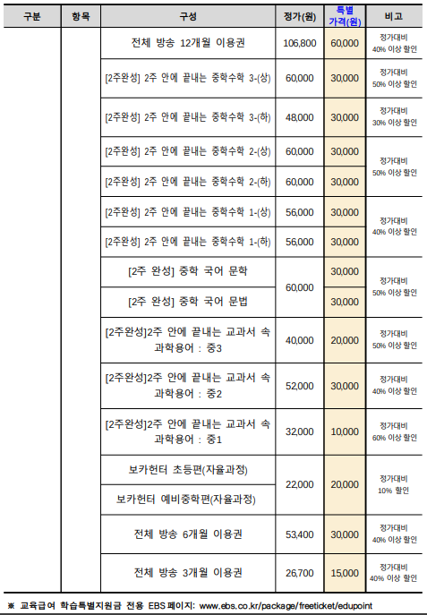 교육급여 학습특별지원금 전용 EBS콘텐츠 상품 구성