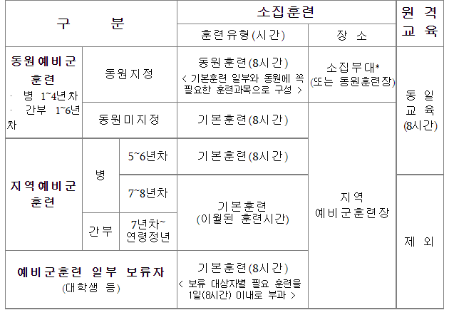 -> 훈련을 받아야 하는 전예비군을 대상으로 소집훈련 1일(8시간)과 원격교육 1일(8시간)을 혼합하여 실시한다고 하니다.