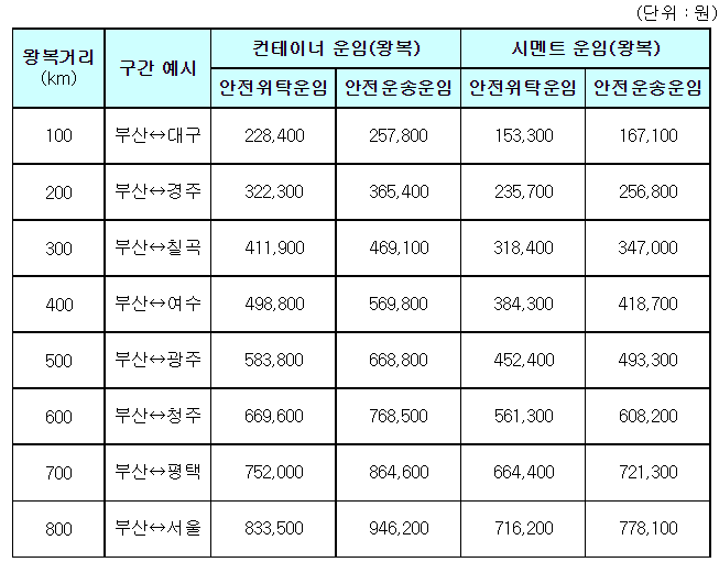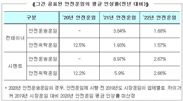 ㅇ (운임 인상) 수출입 컨테이너의 경우 화주가 운수사업자에게 지급하는 안전운송운임은 1.68%, 운수사업자가 화물차주에게 지급하는 안전위탁운임은 1.57% 인상되었으며, 시멘트의 경우 안전운송운임은 2.67%, 안전위탁운임은 2.66% 인상되었다.