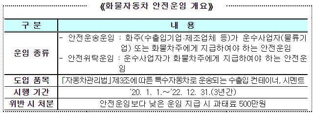 □ 화물차 안전운임제는 과로‧과적‧과속 운행이 잦은 화물운송 종사자의 근로 여건을 개선하고 화물차 안전을 확보하기 위해 화물차주 및 운수사업자가 지급받는 최소한의 운임을 공표하는 제도이다. 화물차 안전운임 제도 도입 당시 시장 혼란에 대한 우려가 있어 수출입 컨테이너‧시멘트 품목에 한하여 3년 일몰제(’20~’22년)로 시행하도록 「화물자동차 운수사업법」이 개정되어 ’20년 1월 1일부터 시행되고 있다.