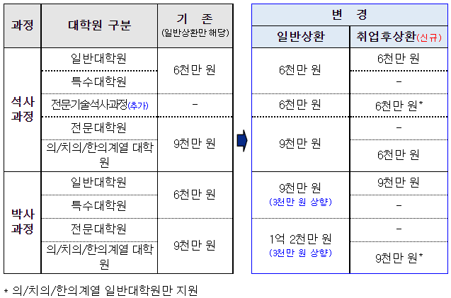④ (대학원생 일반상환 등록금 대출한도) 대학원생 대상 취업 후 상환 학자금 대출(ICL) 시행 및 석·박사 과정의 등록금 소요액 차이 등의 현황을 반영하여 대학원생의 일반상환 학자금대출의 등록금 대출한도를 확대한다.