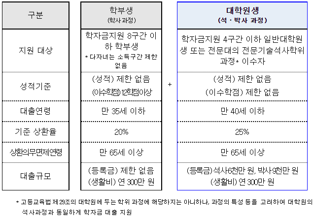 ※ ① 상환기준소득 2,394만 원으로 인상 ② 학자금지원 4구간 이하 일반대학원생까지 지원 ③ 성적 제한 없이 대출 가능 ④ 저소득층 및 다자녀 가구 재학 중 이자 면제 등