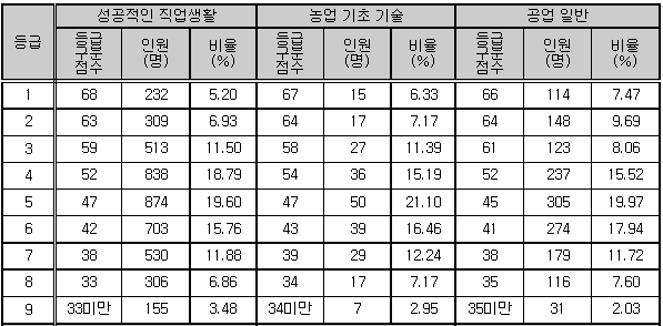 직업탐구 영역의 과목별 등급 구분 표준점수와 등급별 인원 및 비율은 <표 Ⅱ-6>과 같다.