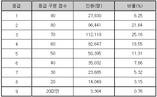 영어 영역의 등급 구분 원점수와 등급별 인원 및 비율은 <표 Ⅱ-3>과 같다.