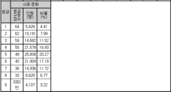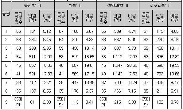 사회·과학탐구 영역의 과목별 등급 구분 표준점수와 등급별 인원 및 비율은 <표 Ⅱ-5>와 같다.