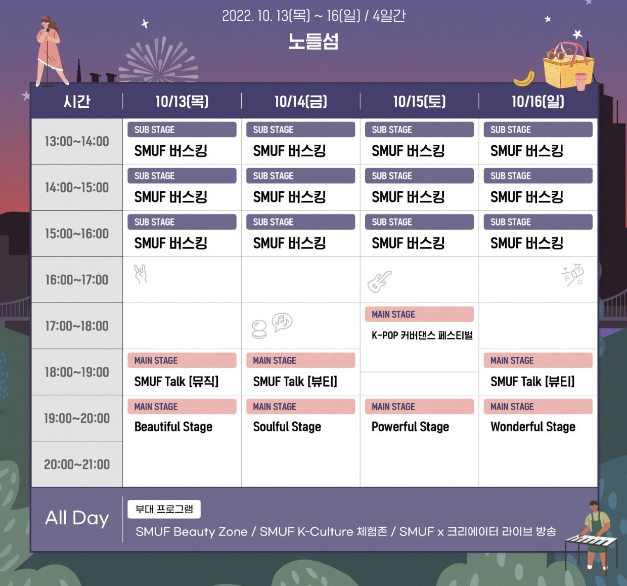 올해 서울뮤직페스티벌 행사는 노들섬의 풍광을 배경으로 매일 다른 분위기로 구성된 음악공연과 다양한 부대행사를 만날 수 있습니다.