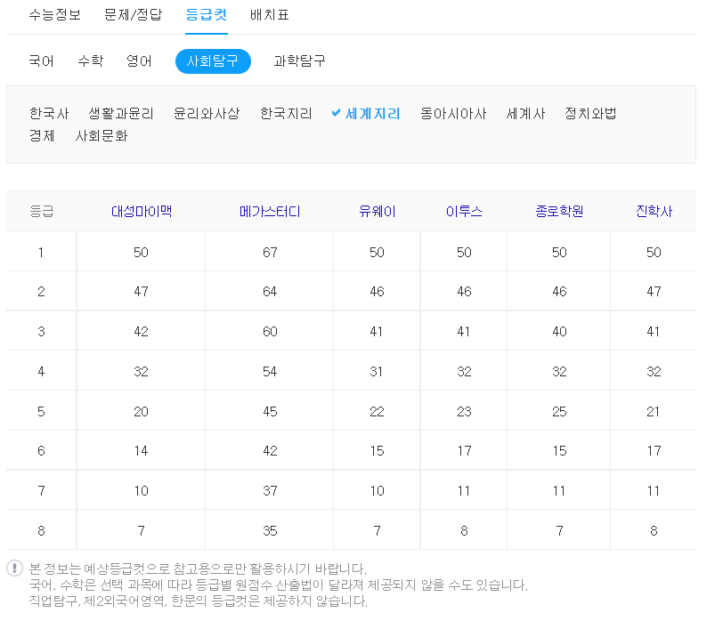 등급 컷이 중요한 이유는 각 대학별로 원하는 등급이 있기 때문입니다.