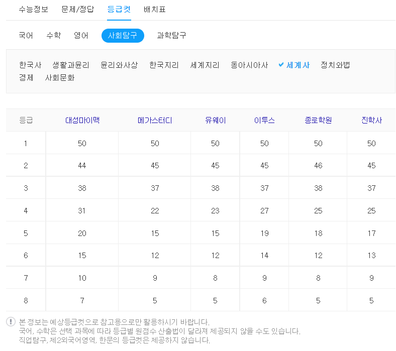 3-7. 2022 수능 사회탐구영역 세계사 등급 컷입니다.