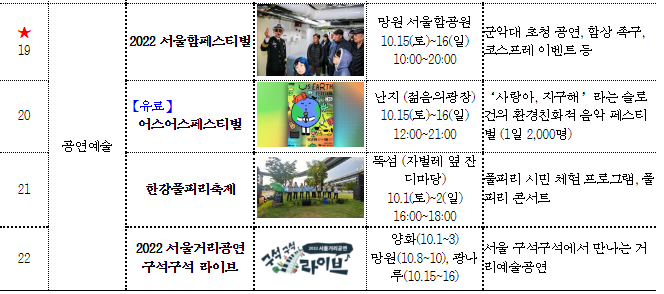 - 서울시 한강사업본부, 2022 한강페스티벌-가을 10월 1일 ~ 16일, 22개 프로그램