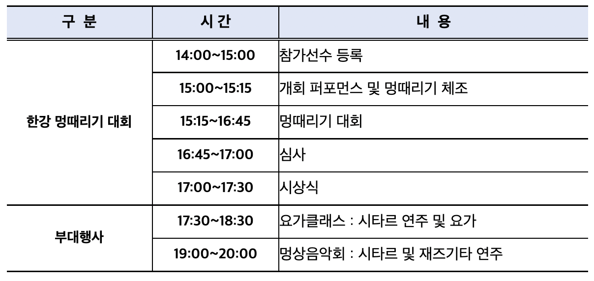 - 주요내용 : 한강 멍때리기 대회 및 부대행사(요가 클래스, 멍상음악회)