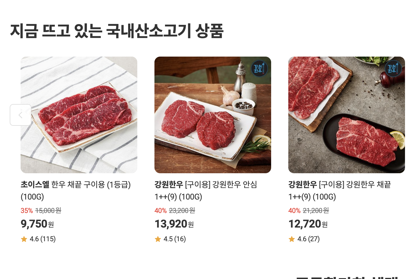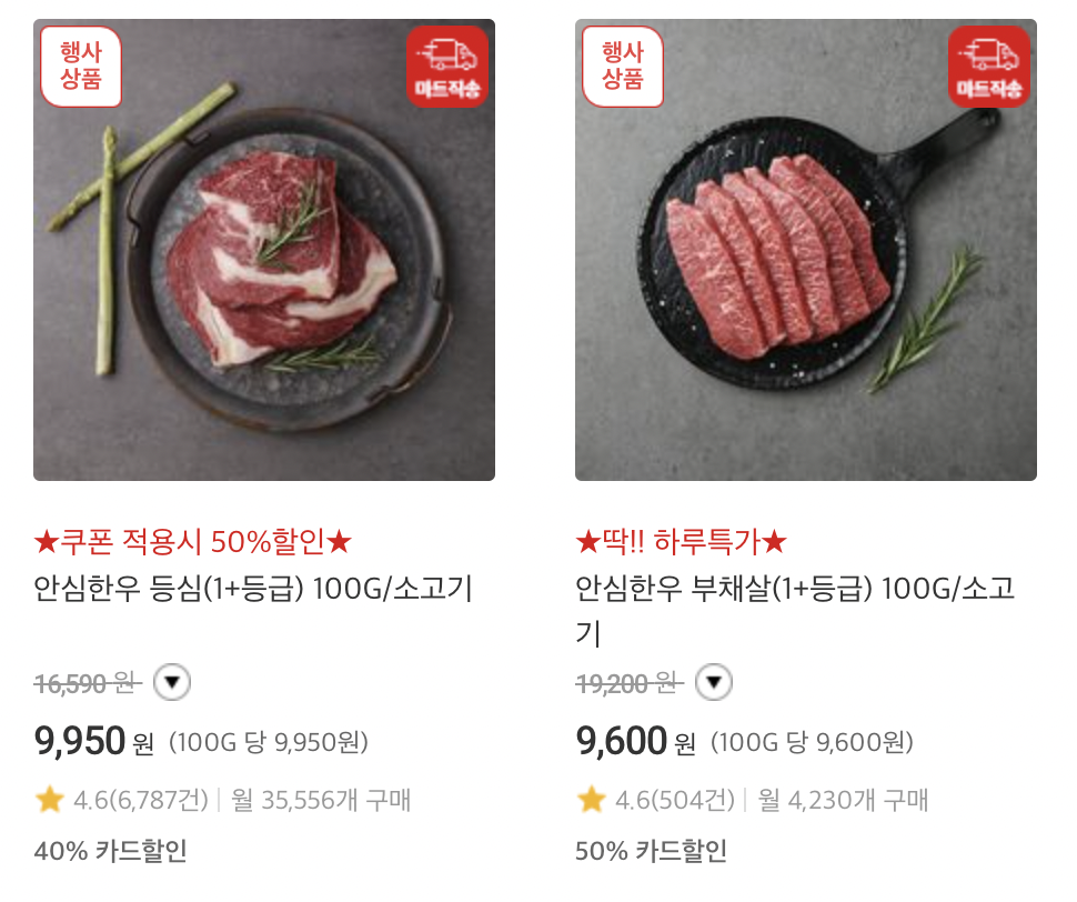 -> 1등급 한우 등심(100g, 냉장, 국내산한우고기)과 '마블나인 한우 등심(100g, 냉장, 국내산한우고기)는 행사 카드 결제 시 50% 저렴한 각 5,750원, 9,700원에 판매