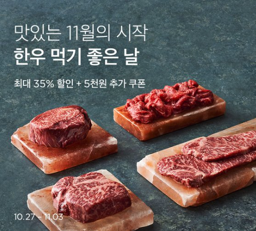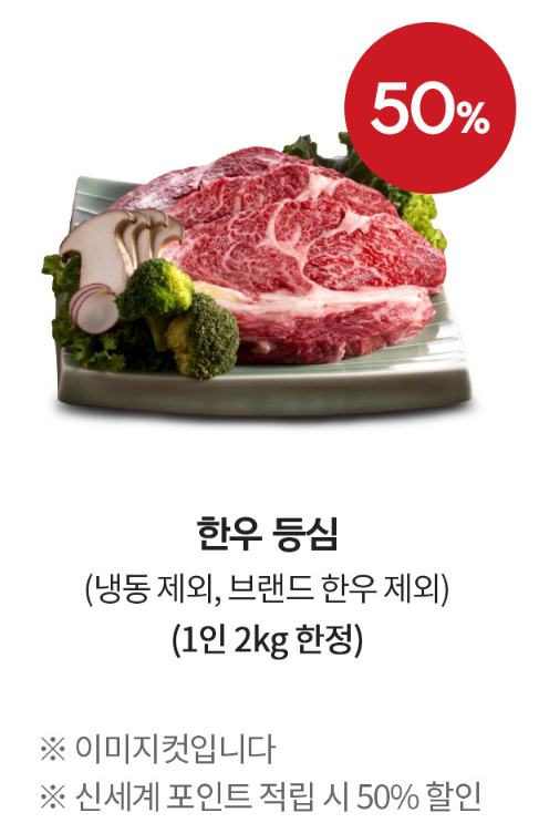 - 할인 행사 : 한우 전품목을 행사카드로 결제할 경우 최대 50% 할인 판매