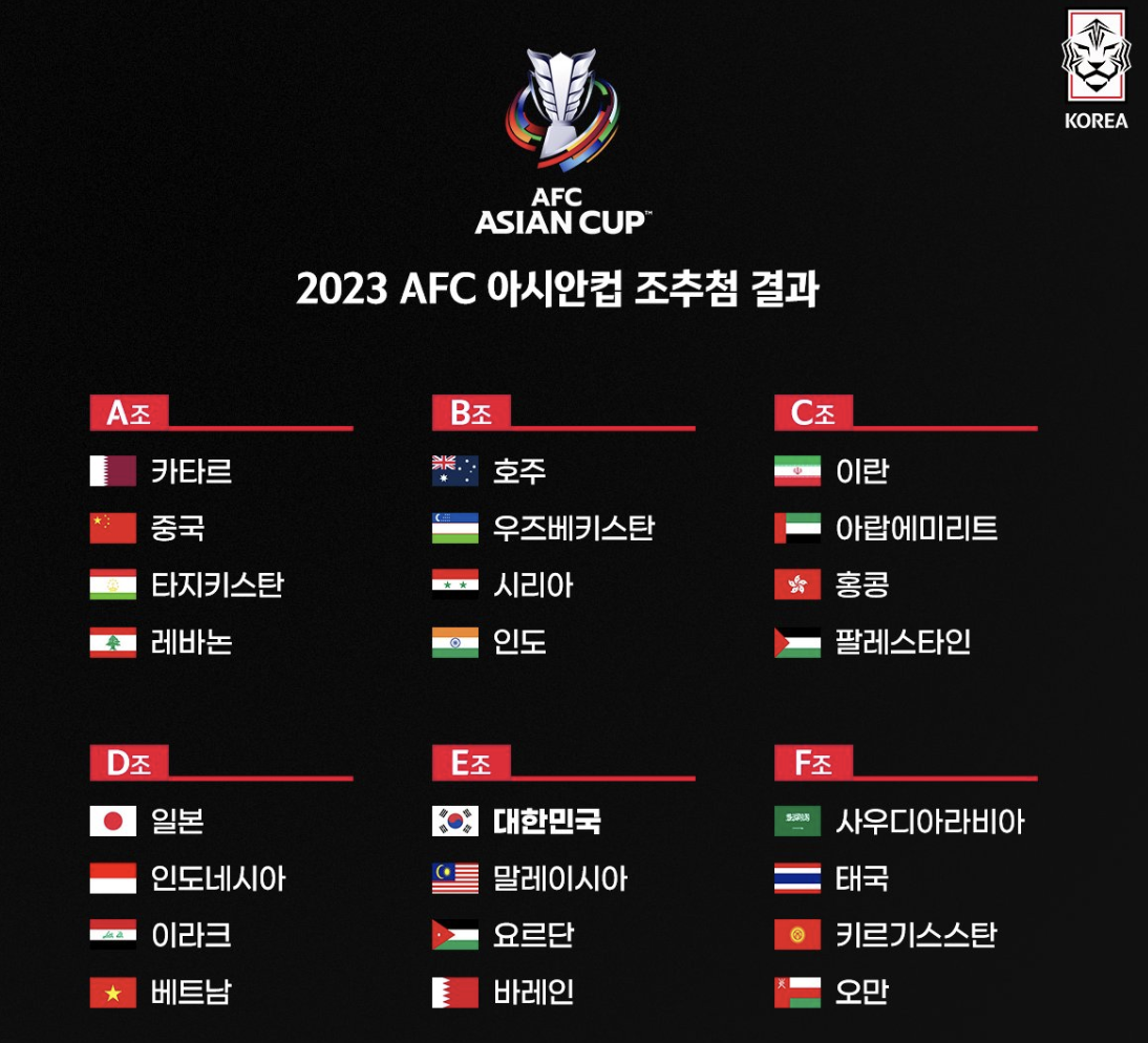 오늘 포스팅에서 중심이 되는 2023 AFC 아시안컵 본선 조편성을 알아보고, 추가로 피파랭킹을 보면서 상대 전력을 간략하게 살펴보도록 하겠습니다.