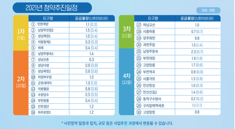 ㅇ 이번에는 3기 신도시인 인천계양(1,050호), 위례신도시(418호), 성남복정1(1,026호), 의왕청계2(304호), 남양주진접2(1,535호)에서 총 4,333호가 공급될 예정이다.