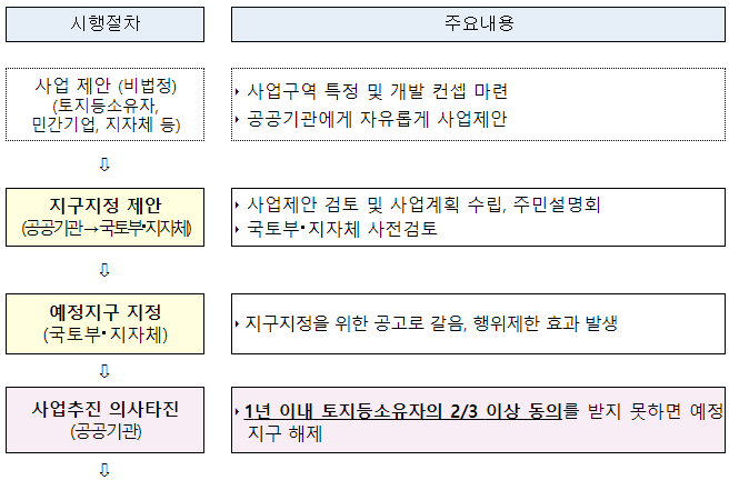 * (사업절차) 지구지정 제안 → 예정지구 지정 → 중도위 심의 → 본지구 지정